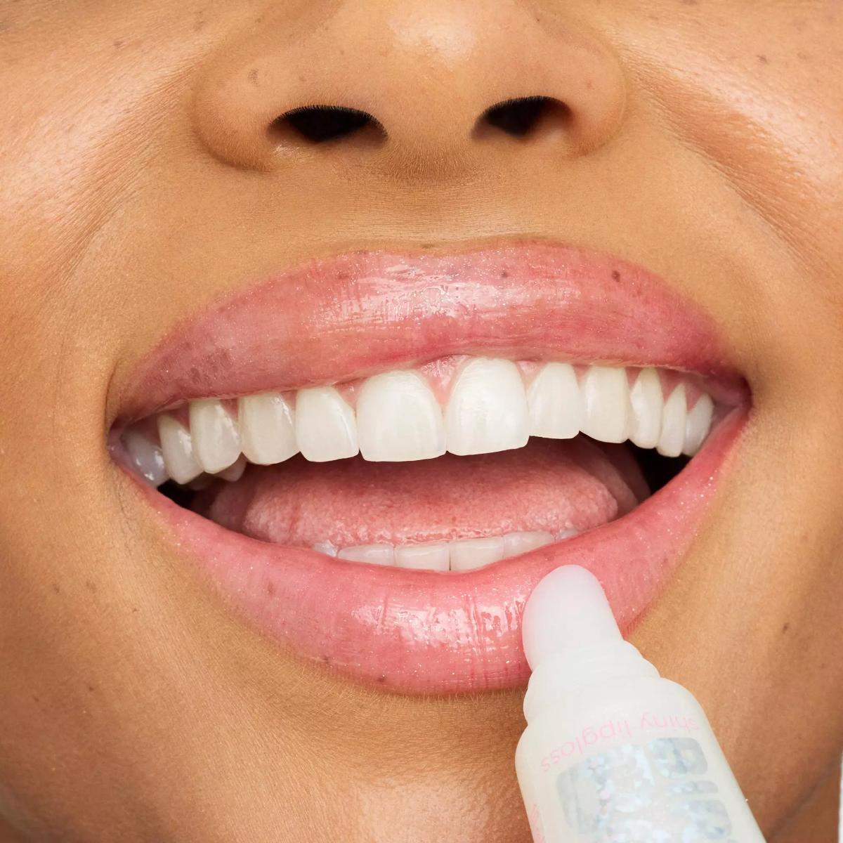 Using the slanted tip applicator, apply essence Birthday Bomb Shiny Lipgloss to lips.