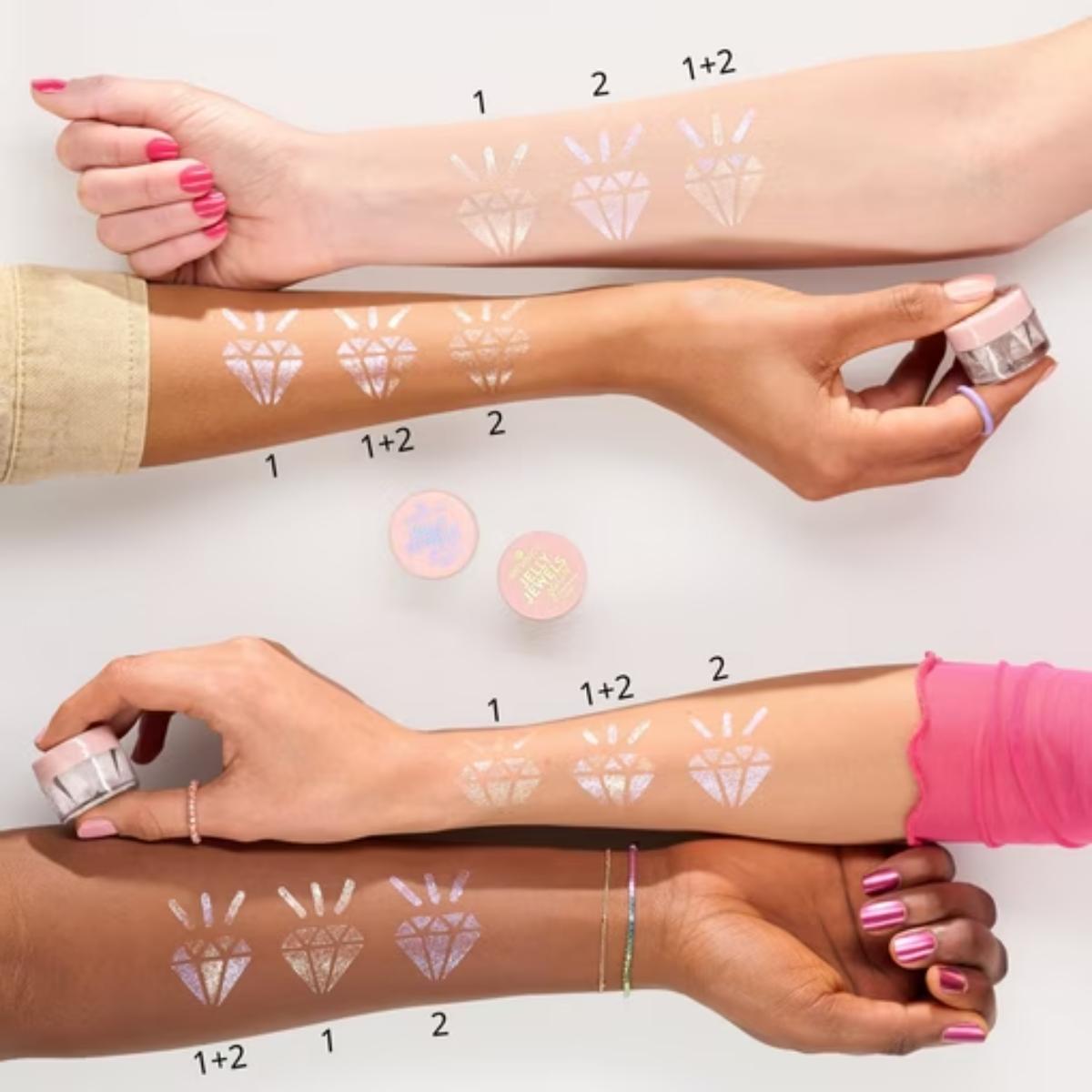 Elevate your eye game with the JELLY JEWELS glitter eyeshadow topper 02 Celestial Shimmer! This ultra-glittery, lightweight topper can be worn alone or layered over your favorite shadow for a dazzling, long-lasting effect. Its water-based, jelly texture delivers intense glitter payoff without feeling heavy. Housed in a crystal-shaped jar and encased in a glittery hot foil box, it's as eye-catching as your look, with this silver multichrome shade! Perfect for adding sparkle to any occasion.